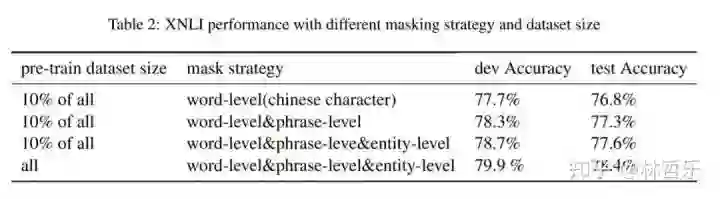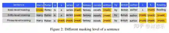 三种mask:字层面、短语层面、实体层面(引入外部知识,模型可获得更可靠的语言表示)
