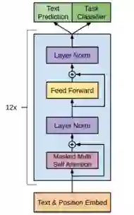 GPT只用了transformer的decoder模块提取特征,而不是Bi-LSTM;堆叠12个