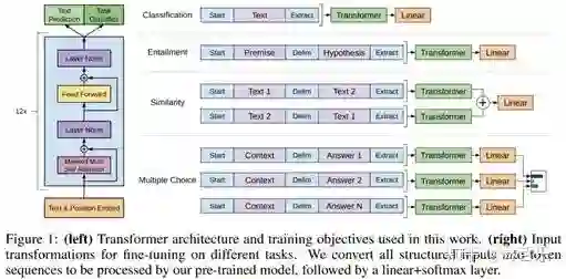 对于多项选择问题,则多路输入,每一路把文章和答案选项拼接作为输入即可。从上图可看出,这种改造还是很方便的,不同任务只需要在输入部分施工即可。