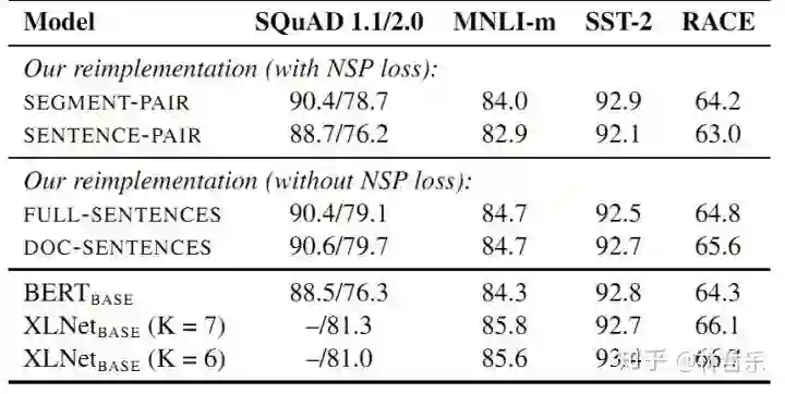 SENTENCE-PAIR + NSP:输入也是包含两部分,每个部分是来自同一个文档或者不同文档的单个句子,这两个句子的token 总数少于 512 。由于这些输入明显少于512 个tokens,因此增加batch size的大小,以使 tokens 总数保持与SEGMENT-PAIR + NSP 相似。预训练包含 MLM 任务和 NSP 任务。
