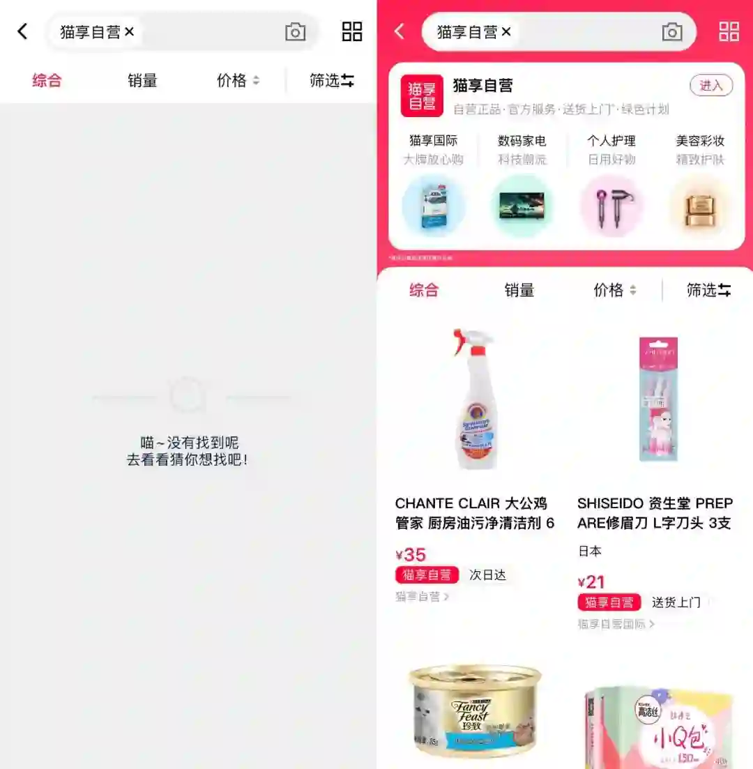 但据36氪-未来消费观察,猫享实际上线时间较这次版本更新有所延迟——至少在4天(2月22日)后,搜索“猫享/猫享自营”等字样,才会出现自营商品。