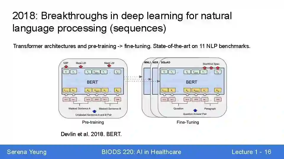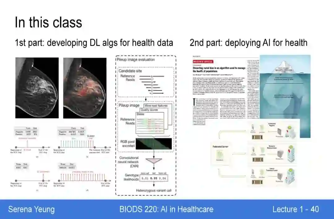 医疗保健是人工智能最令人兴奋的应用领域之一,在医学图像分析、基于电子健康记录的预测和精确医疗等领域具有变革潜力。本课程将深入探讨医疗领域人工智能的最新进展,特别关注医疗问题的深度学习方法。我们将从神经网络基础开始,然后在各种医疗保健数据(包括图像、文本、多模态和时间序列数据)的背景下研究前沿的深度学习模型。在本课程的后半部分,我们将讨论在社会应用(如医疗保健)中整合人工智能所面临的开放挑战,包括可解释性、健壮性、隐私性和公平性。本课程旨在为来自不同背景的学生提供医疗领域人工智能前沿研究的概念理解和实践基础。