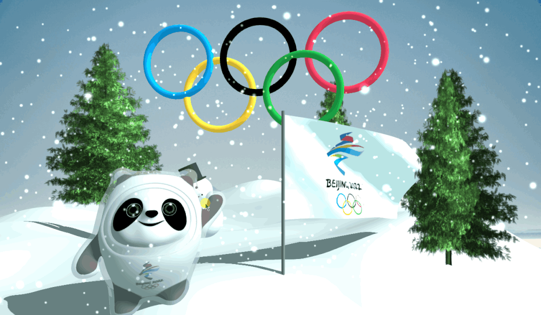 实现效果如以下动图所示,页面主要由 2022 冬奥会吉祥物 冰墩墩 、奥运五环、舞动的旗帜、树木、以及下雪效果等组成。