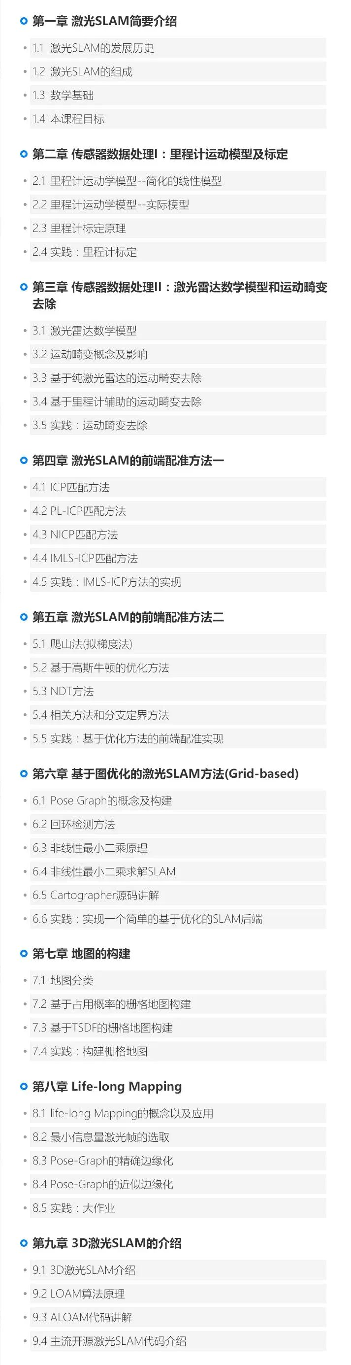 为解决伙伴们学习中遇的问题,深蓝学院开设了『激光SLAM理论与实践』课程。希望大家通过8周的时间,用最高效的学习方法,结合完整的实践方案,理解激光SLAM的算法原理,动手实现各个模块,真正做到从头实现完整激光SLAM方案。