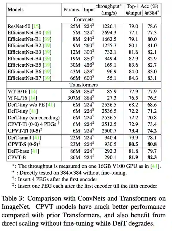 该研究将添加了 PEG 的 Vision Transformer 模型命名为 CPVT(Conditional Position encodings Visual Transformer)。在 ImageNet 数据集上,相同量级的 CPVT 模型性能优于 ViT 和 DeiT。得益于隐式条件编码可以根据输入动态调整的特性,基于 224×224 输入训练好的模型可以直接处理 384×384 输入(Table 3 最后一列),无需 fine-tune 就能直接获得性能提升。相比之下,其他显式编码没有 fine-tune 则会出现性能损失。