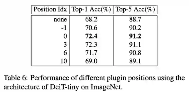 ViT 主干由 12 个 Encoder 组成,CPVT 对比了 PEG 位于 -1、0、3、6、10 等处的结果。实验表明,PEG 用于第一个 Encoder 之后表现最好 (idx 0)。该研究认为,放在第一个 encoder 之后不仅可以提供全局的接受域,也能够保证模型尽早地利用到位置信息。