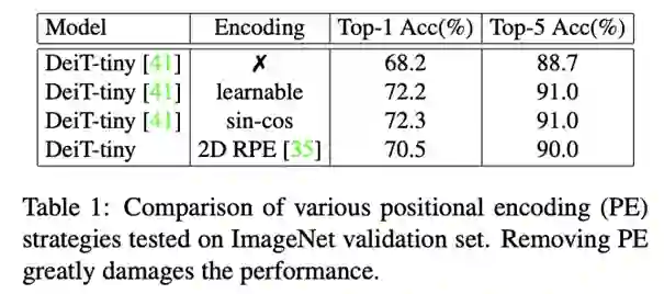 在 ViT 和 CPVT 的实验中,我们可以发现没有位置编码的 Transformer 性能会出现明显下降。除此之外,在 Table 1 中,可学习(learnable)的位置编码和正余弦(sin-cos)编码效果接近,2D 的相对编码(2D RPE)性能较差,但仍然优于去掉位置编码的情形。