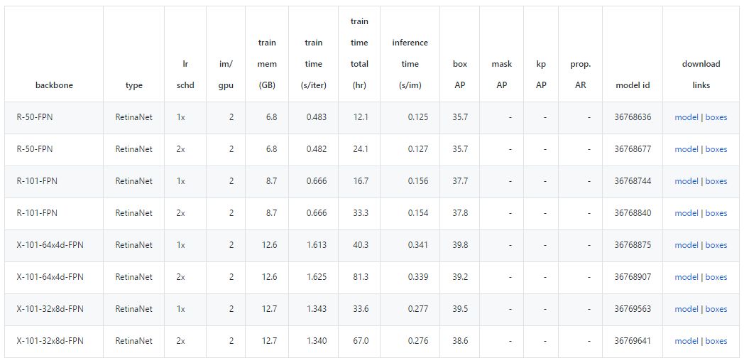 上述的检测算法和 CNN 架构在目标检测任务上都有非常好的效果,他们基本上展现了该领域最优的水平。而 Detectron 包含了这些算法和架构的一大组基线结果和已训练模型,我们可以直接下载它们。例如下图是 RetinaNet 的基线结果与对应的模型下载地址,它同时还提供了训练和推断过程中的有用数据。