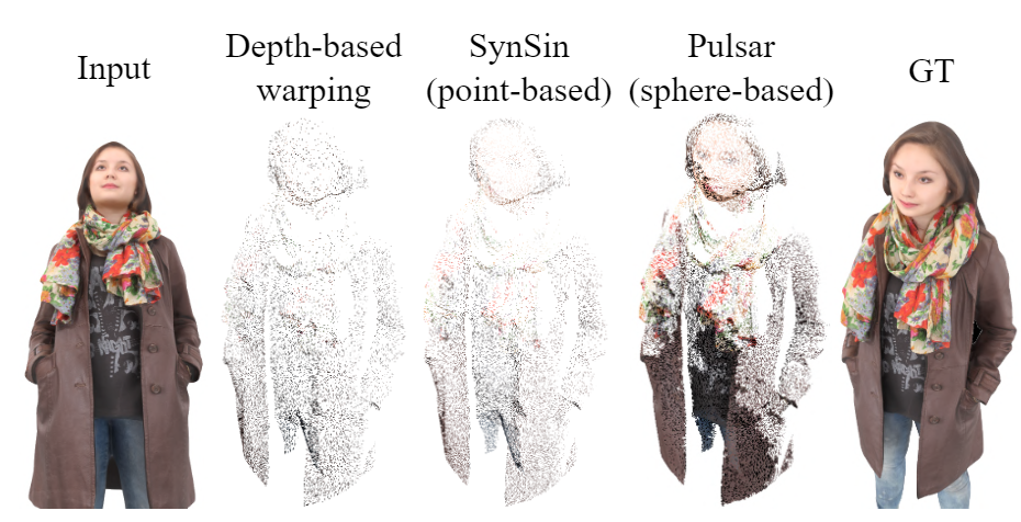 考虑到从原始视点出发的每个像素的深度以及相机参数,这些点自然可以被投影到一个新的视图,这也使得使用基于深度的扭曲或可微分的点或球体的渲染器是开发视图合成的第一步的最佳选择。投影的过程能够自动纠错(除了传感器的噪声),且不受训练误差的影响。
