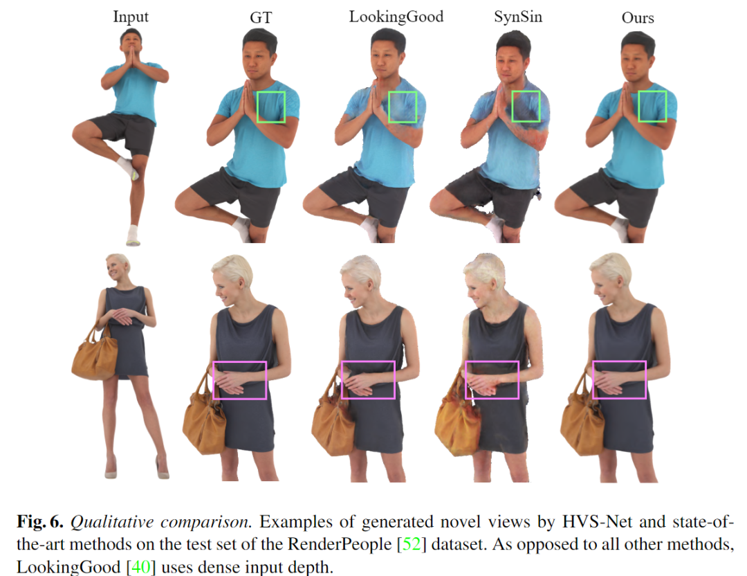 相比之下,HVS-Net方法不仅能够呈现可信的、真实的新视图,而且还能创造出忠实于输入视图的视图,重点是,HVS-Net在输入信息更少的情况下对两个主体的头发进行相当准确的预测。