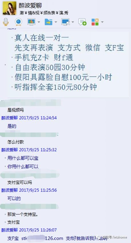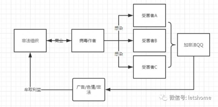 首先,非法组织找到了病毒木马作者,达成了合作的关系,于是在下载站,网盘等地投放病毒,受害者中招后,莫名其妙的加了一些不认识的QQ好友,这些好友,会在QQ空间和QQ群里投放一些“色情”广告,如果有用户抵挡不住 诱惑,按照广告中提示要求加了指定的QQ号(QQ的背后可能是一位扣脚大汉),对方会以诱惑性的美女图片来诱惑用户观看视频,用户需要支付价格在50RMB~150RMB的金额才能进行体验。而实际收款的却是扣脚大汉!