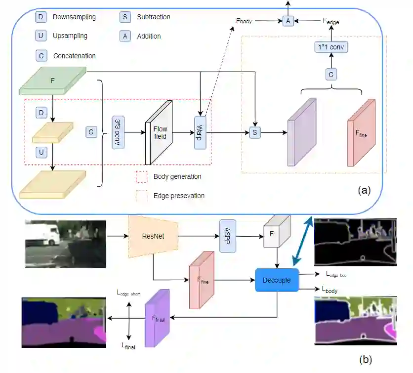 现有的语义分割方法要么通过对全局上下文信息建模来提高目标对象的内部一致性,要么通过多尺度特征融合来对目标对象的边界细节进行优化。本文提出了一种新的语义分割方法,本文认为性能强的语义分割方法需要明确地建模目标对象的主体(body)和边缘(edge),这对应于图像的高频和低频信息。为此,本文首先通过warp图像特征来学习 flow field使目标对象主体部分更加一致。在解耦监督下,通过对不同部分(主体或边缘)像素进行显式采样,进一步优化产生的主体特征和残余边缘特征。通过实验表明,所提出的具有各种基准或主干网络的框架可有更好的目标对象内部一致性和目标对象边界。在包括Cityscapes、CamVid、KIITI和BDD在内的四个主要道路场景语义分割数据集上进行的大量实验表明,本文提出的方法实现了SOTA,同时保持了较高的推理效率。特别是,本文的方法仅使用精细标注的数据就可以在Cityscapes数据集上达到83.7 mIoU。