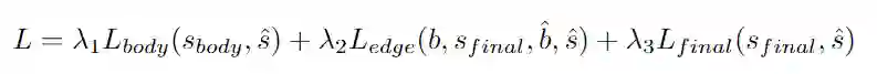 因为每个部分都有特定的目的。特别是,可以为body和edge附加辅助监督损失。对于边缘保留模块,预测了训练过程中的边界映射,它是图像中对象和填充类的所有轮廓的二进制表示。总损失函数是计算如下: