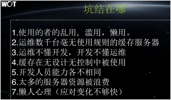 懒人心理,应对变化不够快。应对高并发量,十个程序员有五个会说:为数据层添加 Cache,而不会真正去为架构做长远的规划。