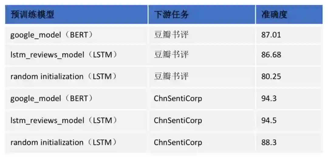 ▲ 表1. 加载不同预训练模型在书评情感分类任务上的对比