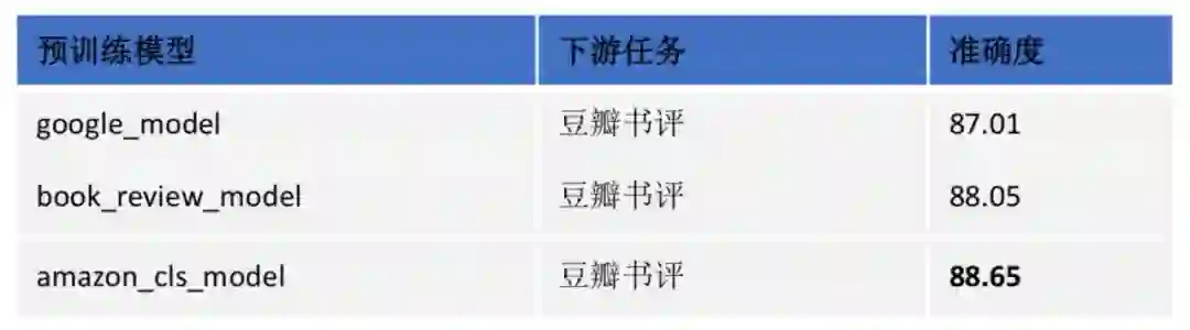 上面的模型只是在小规模语料上训练的结果。我们可以从 UER 的模型仓库中去搜索更加合适的预训练模型。Amazon_cls_model.bin 使用分类目标任务和 Amazon 评论语料 [10] 进行预训练。由于这个模型的语料和书评语料性质接近,并利用了有监督信息 [3],所以这份预训练模型可能对于书评数据集是一个很好的选择。
