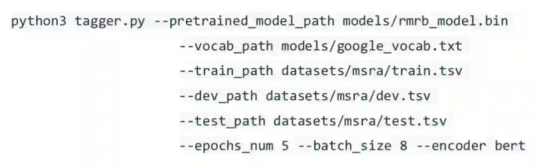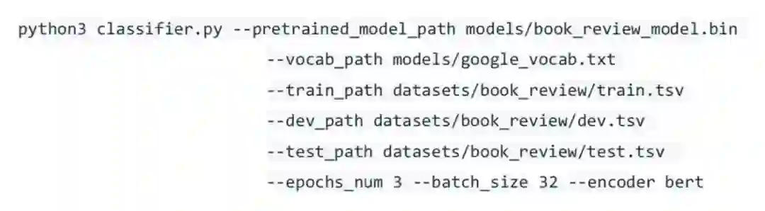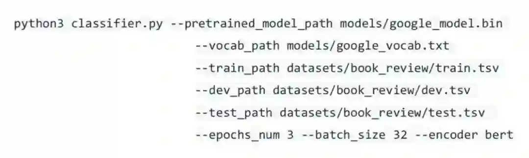 这里简单介绍一下各个选项的意义:--pretrained_model_path 指定预训练模型的路径;--vocab_path 指定词典的路径;下游任务数据集路径通过 --train_path、--dev_path、--test_path 指定;--encoder 指定我们使用的编码器,这里使用 BERT 中的 12 层 Transformer 编码器。