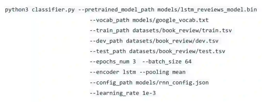 这里仍然使用上面的豆瓣书评数据集对模型进行评估。我们在模型仓库中选择一个基于 2 层 LSTM 编码器的预训练模型,lstm_reveiews_model.bin。这个模型首先在大规模混合语料上用语言模型(LM)作为目标任务进行预训练,然后再在 Amazon 带标签的评论语料 [10] 上用语言模型(LM)和分类(CLS)目标任务进行预训练。我们将这个预训练模型用于豆瓣书评数据集上:
