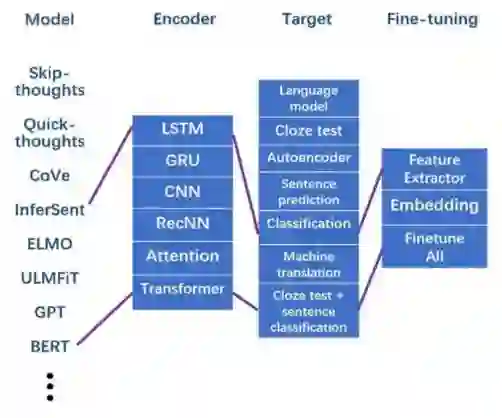 预训练模型一般分成四个部分:语料、编码器、目标任务以及微调策略。已有的工作从这四个部分中选择不同的模块(比如选择不同的目标任务),构成一个预训练模型(如下图所示)[1,2,3]。