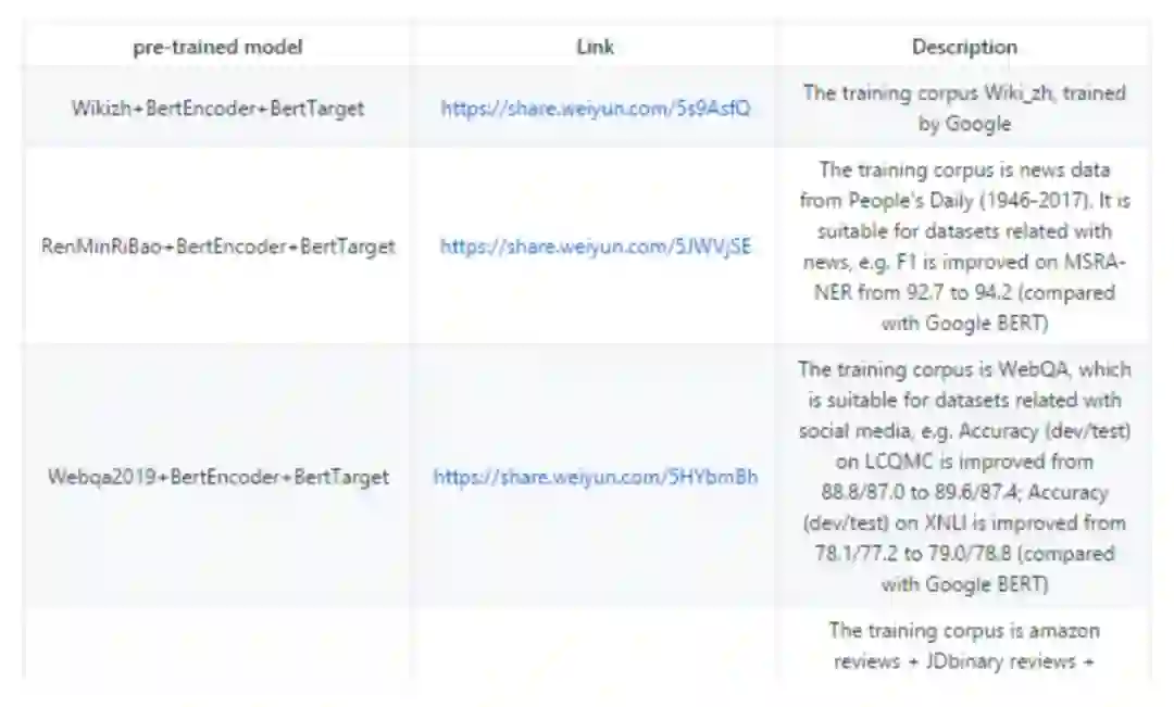 图 3 给出了我们已有的语料、编码器、目标任务的组合。图 4 给出了项目中预训练模型下载链接和描述的截图。