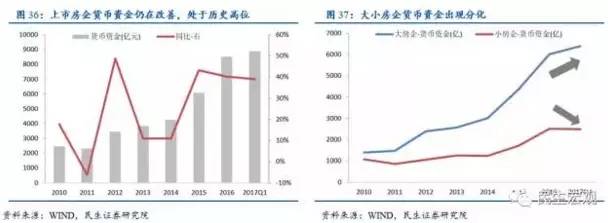 民生宏观固收研报分析,截至2017年一季度末,上市房企货币资金合计8885亿元,同比增长39%,比2016年底降低1个百分点。虽然货币资金的同比增速已经有所回落,但货币资金的绝对值仍处在历史最高位。大小房企货币资金情况出现分化,与2016年底相比,2017年一季度末大房企货币资金增加360亿元,而小房企减少10亿元。