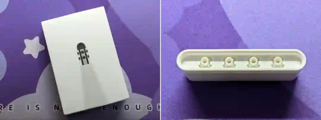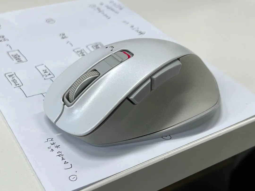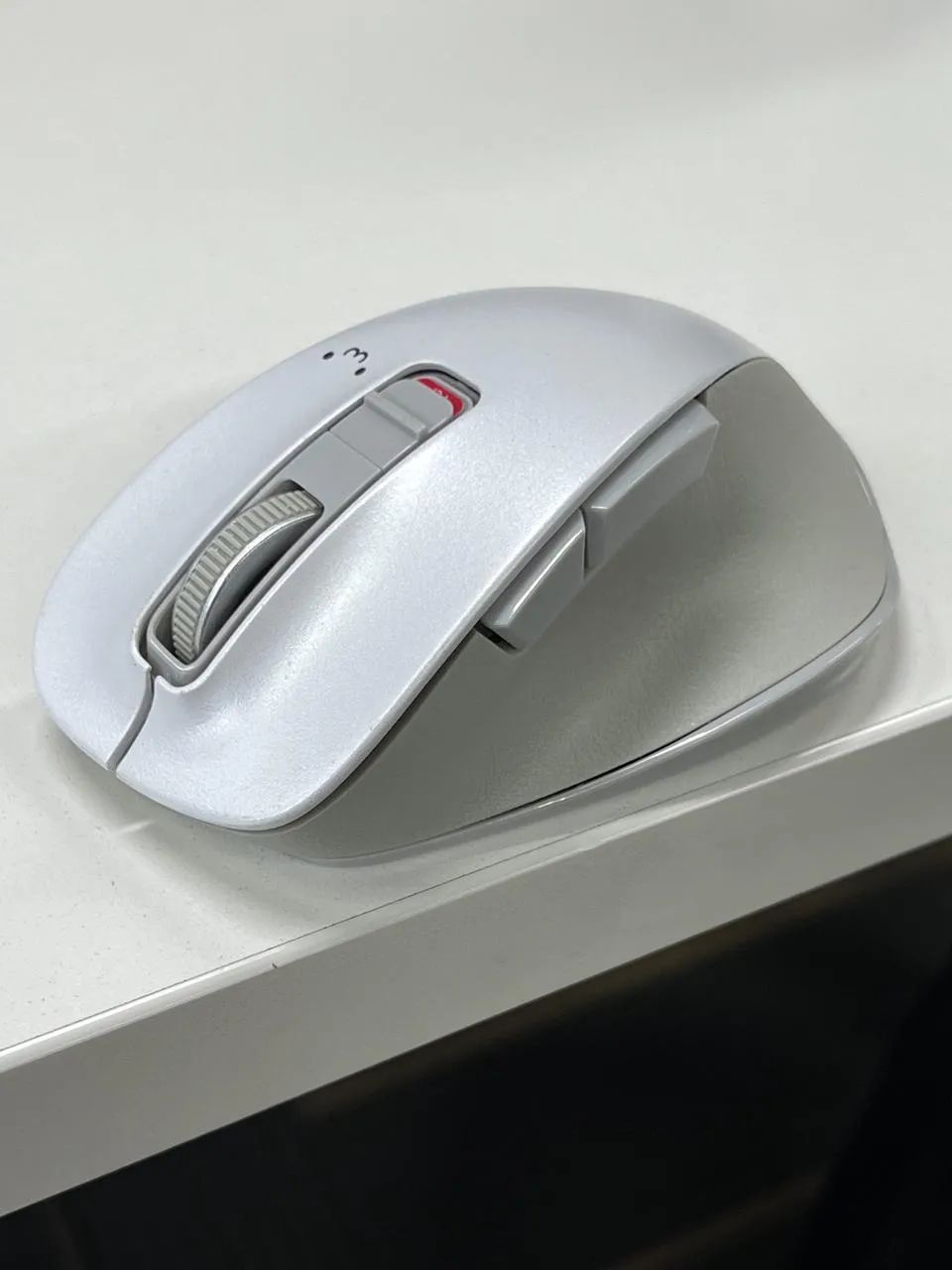在看过评论中 M 和 L 大小反馈后,我选择了这支 M 大小、蓝牙白色款。在可可爱爱的笑脸旁(真正的购买原因 🌚),有支持切换两个连接设备的开关,能够应对家中和公司不同设备的使用场景。左侧两个稳稳的按钮,支持通过驱动自定义按键效果,滚轮也支持点击,再匹配上不算贵的价格,可以说是鱼和熊掌兼得了。