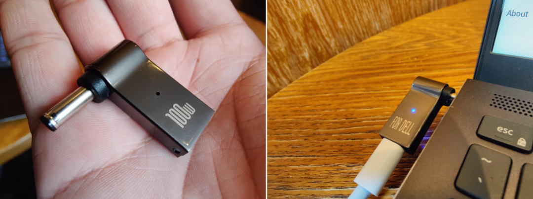 这个 U 盘一般体积的小玩意公头适配各类电脑的专用电源插孔,母头则是标准的 Type-C,用于接入支持 PD 的充电器。插入电源后蓝色指示灯会亮起。