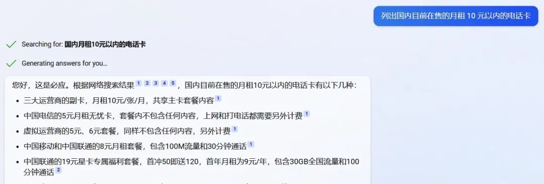 另外,AI 还提到了中国移动和联通的 8 元套餐。这类套餐并不能在官方公开的套餐列表中找到,但确实存在,某些地方营业厅以及携号转网的用户可能有此选择。