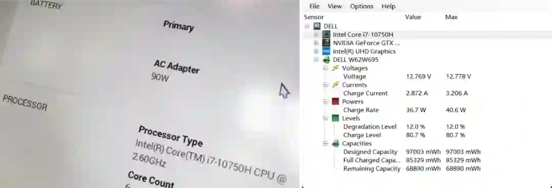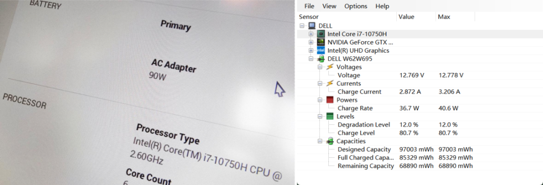 根据 BIOS 的数据,这个小转换头能提供 90W 的功率;大部分轻负载情况下,都能够稳定给电池提供 40W 上下的充电功率,和原装充电器相当: