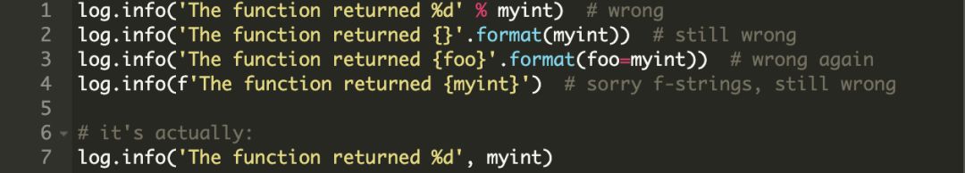 每个人都应该知道,你需要记录日志,尤其是在开发的时候。并且在记录日志的时候,不应该使用常规的 Python 字符串语法,它有自己的 基于 *arg 的解包语法:
