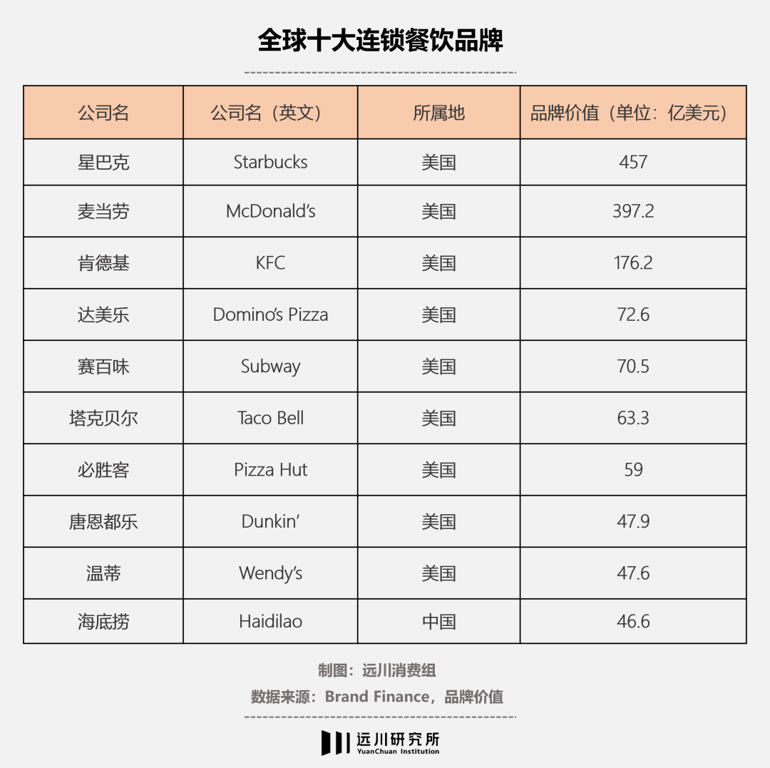 全球十大连锁餐饮品牌里,美国拿走九席,剩下一个海底捞从人口数量占优的中国走出,但“全球连锁”这个称呼略微站不住脚,毕竟超过90%的门店都来自本土。