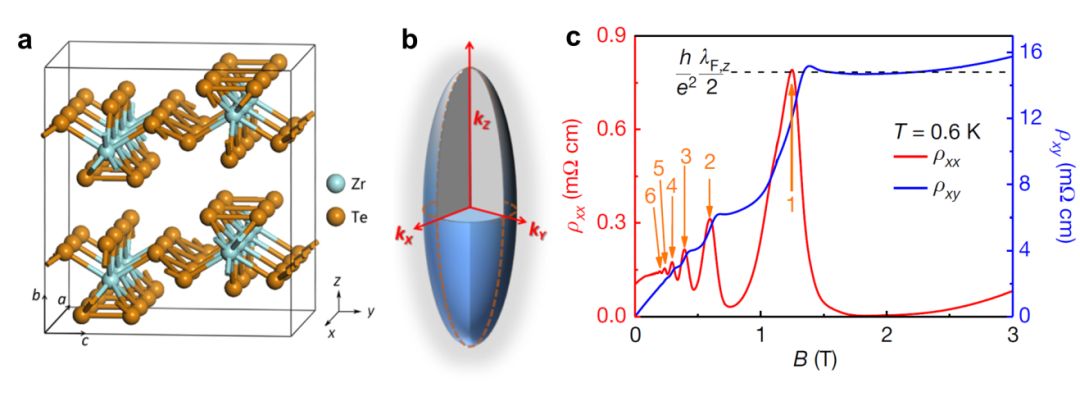 图2:a: ZrTe5的晶格结构。b:实验测量的费米面形状。该费米面是封闭的,表征该电子体系的三维特性。c: 三维量子霍尔现象。