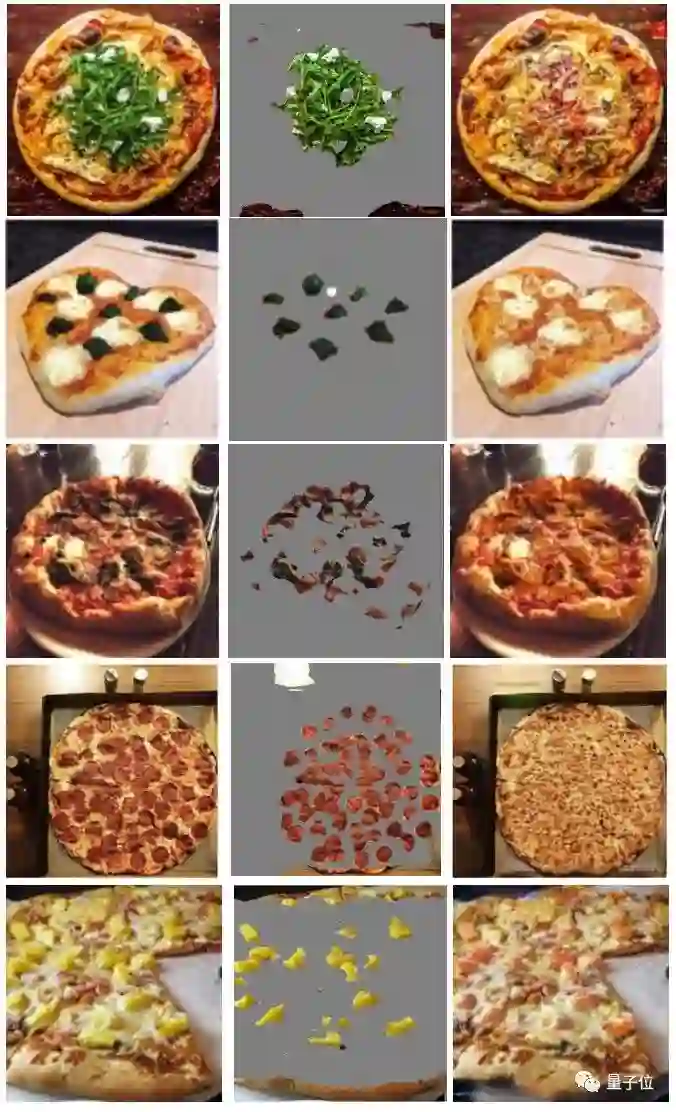 另外,由生到熟的过程,对人间的食物来说并不可逆。但AI能把已经烤熟的披萨,变回刚刚撒完配料的样子: