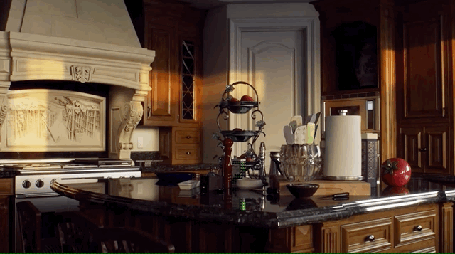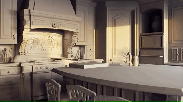 在厨房场景中,一共出现了57个独特3D模型和6240个对象,它们的建模工作都是在Autodesk 3ds Max、Autodesk Maya 和 Pixologic Zbrush中完成的。