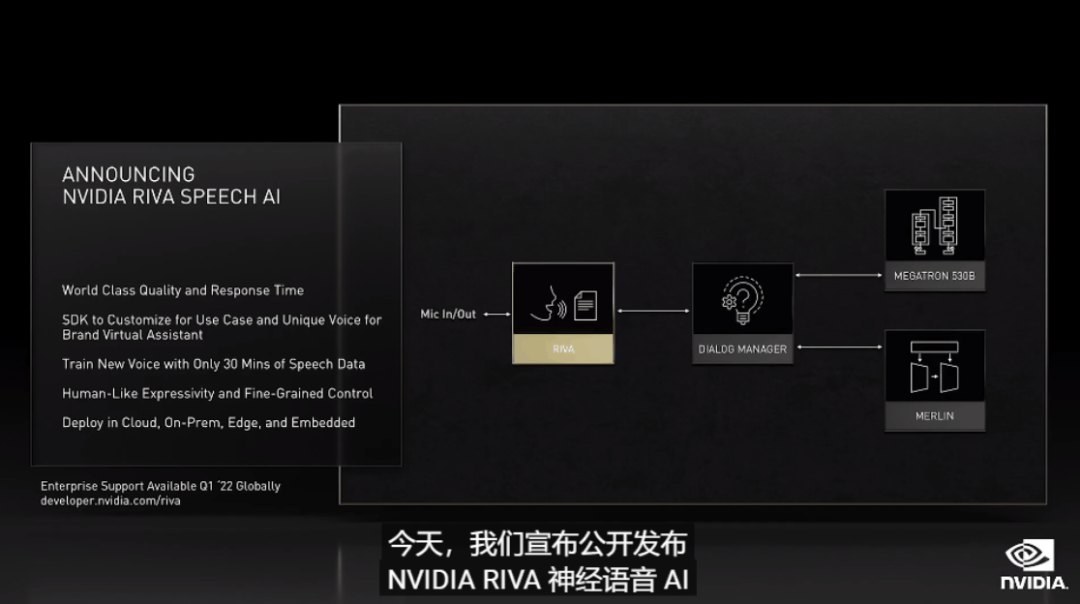Omniverse Avatar的语音识别基于英伟达Riva,这是一个软件开发工具包,可以识别多种语言的语音。Riva还可以利用文本到语音生成功能生成类似人类的语音。