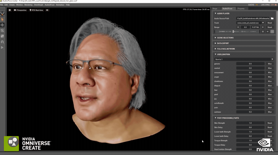 虚拟人的面部动作只需要导入纯音频后,Audio2Face能根据语音内容自动生成。