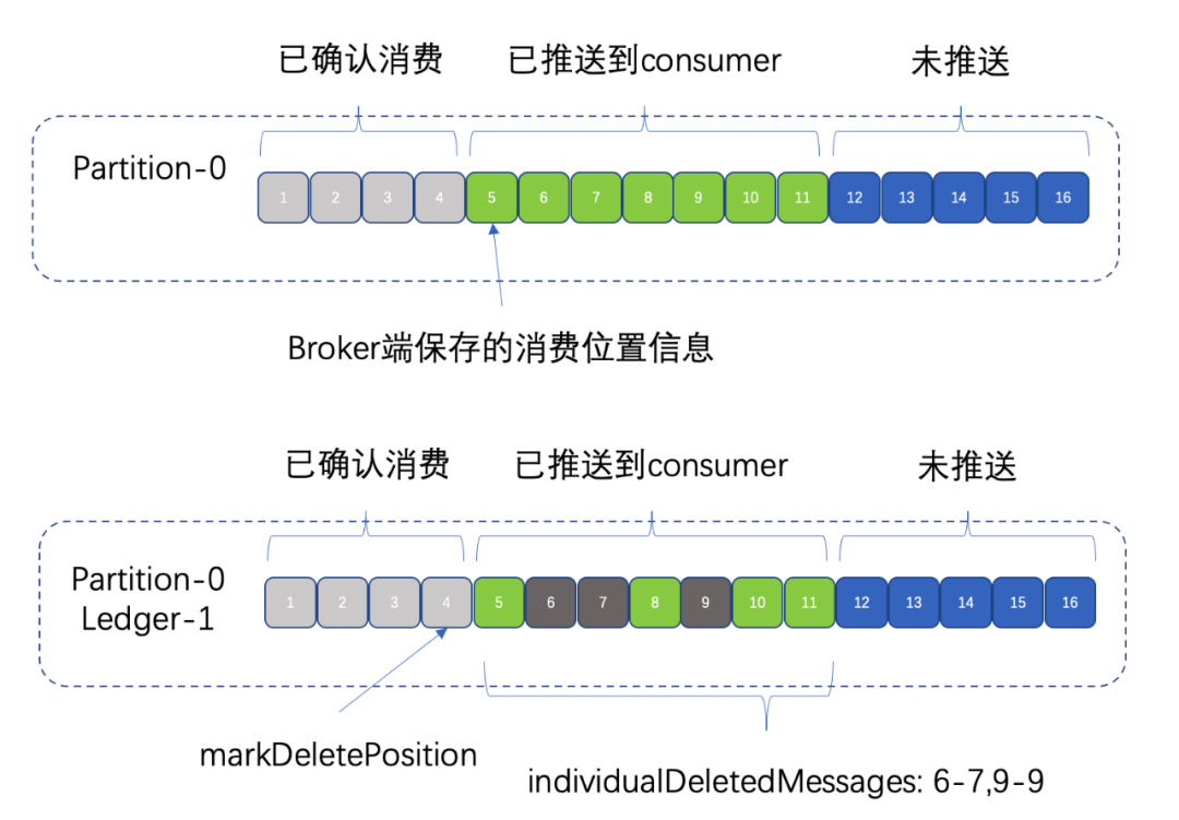 与 Kafka、RocketMQ、TubeMQ 等不同,Apache Pulsar 不仅仅会针对每个订阅的消费进度保存一个最小的确认位置(即这个位置之前的消息都已经被确认已消费),也会针对这个位置之后且已经收到确认响应的消息,用 range 区间段的方式保存确认信息。