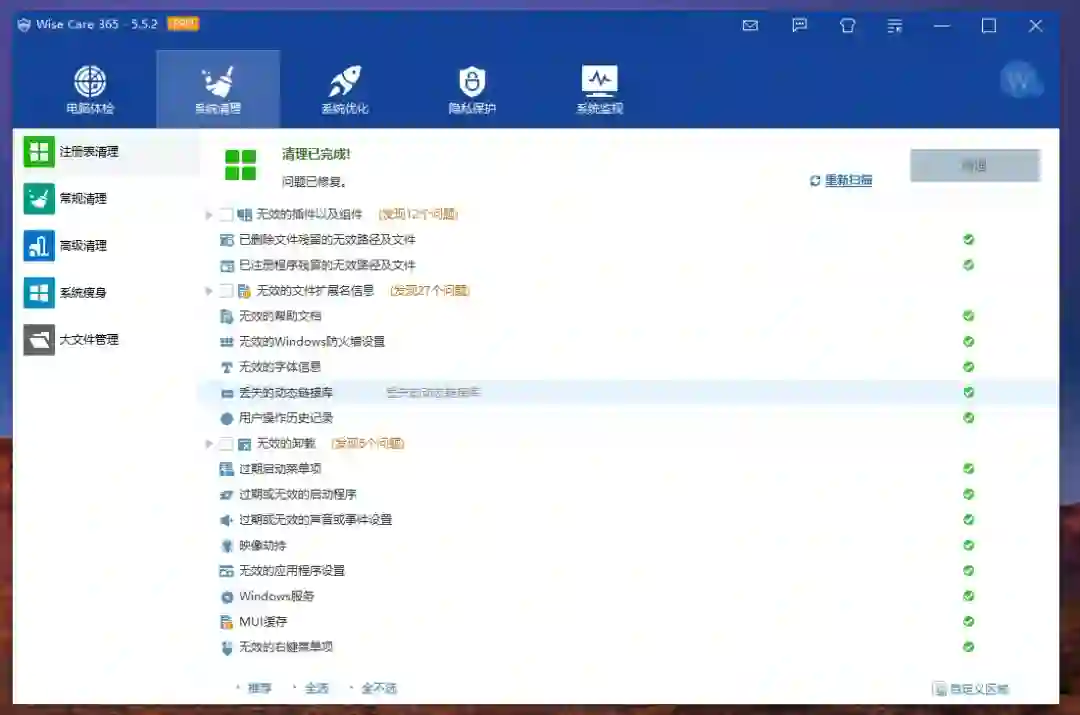 如果你并不希望通过所谓的体检的方式进行维护,也可以直接前往子项页面单独操作。每一个子项目中都罗列了可以进行操作的部分,以我自己最常用的系统清理为例,Wise Care 365 提供的清理功能包含注册表清理、常规清理、高级清理以及系统瘦身等常见功能,和同类清理工具一样,我们可以对扫描结果中的清理项目进行自定义选择,根据需要清理或忽略某些项目。