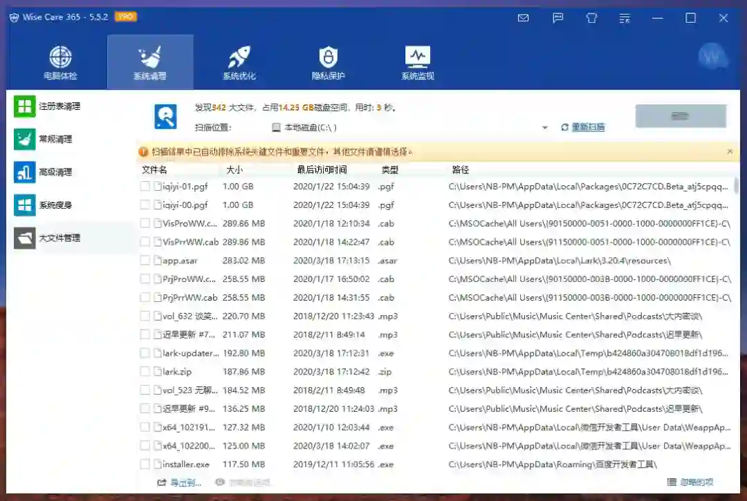 既然是花钱,那么我们当然希望的是花的值,Wise Care 365 的专业版最主要的是加入了一些专业功能模块,比如说对于一些系统中的大文件,看上去非常占用空间,就可以通过其「大文件管理」功能进行分析,告诉你这些大文件能不能删除。