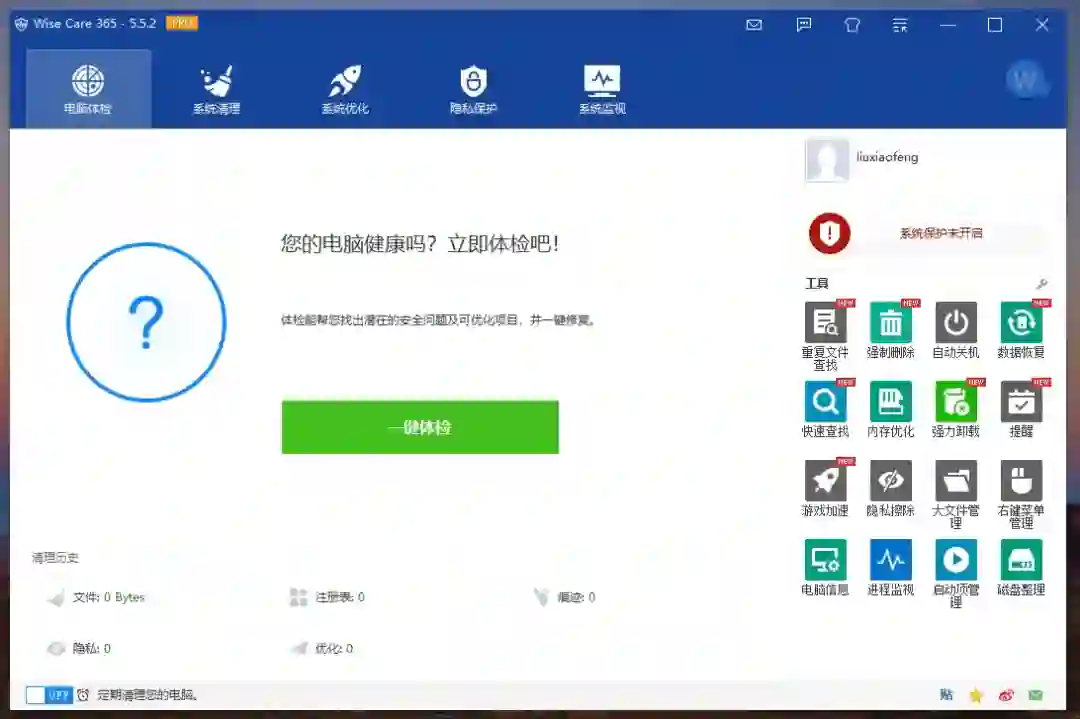 主要功能上,Wise Care 365 围绕系统维护这一核心功能分为「系统体检」「系统清理」「系统优化」「隐私保护」以及「系统监控」五大模块。所以经过对比不难发现,Wise Care 365 功能更为纯粹和垂直,没有国内同类应用中常见的软件下载中心、驱动下载中心这类工具集成。更重要的是,这里面大部分功能并不需要升级至专业版,免费版授权就可以正常使用。