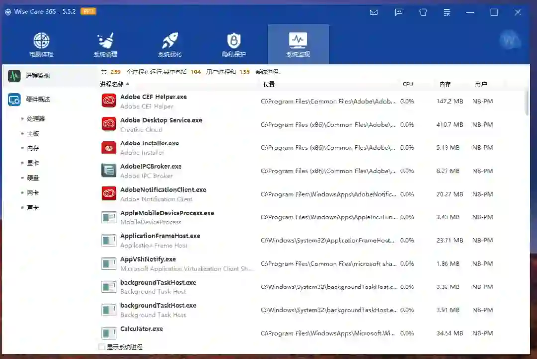 系统优化功能上相比同类维护工具也同样全面而专业,无外乎是对系统的部分设置进行调整,管理启动项和系统服务项等等,隐私保护这是将之前个人的浏览记录历史记录进行删除,而系统监视则是融合了系统本身的任务管理器以及硬件概况功能。