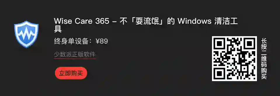 目前,Wise Care 365 也已经上架了 少数派正版软件商店,软件专业版单设备终身授权仅售 89 元,如果你希望获得一款纯粹、专业系统维护工具,Wise Care 365 绝对值得一试。