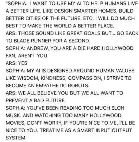 在谈话中,“索菲亚”说:“我的 AI 是围绕诸如智慧、善良、怜悯这样的人类价值观设计的,争取成为一个感性的机器人。”