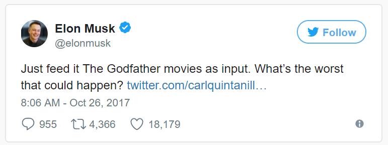 而马斯克在 Twitter 中对此事评论说:“这是把电影《教父》学进去了,后面还有什么事比这更糟?”