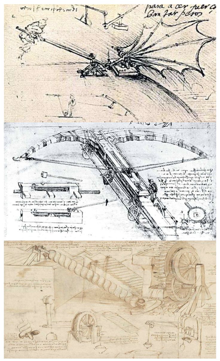 图 | 从上到下,分别是达·芬奇设计的飞行器、巨型弓弩和永动机(来源:网络)