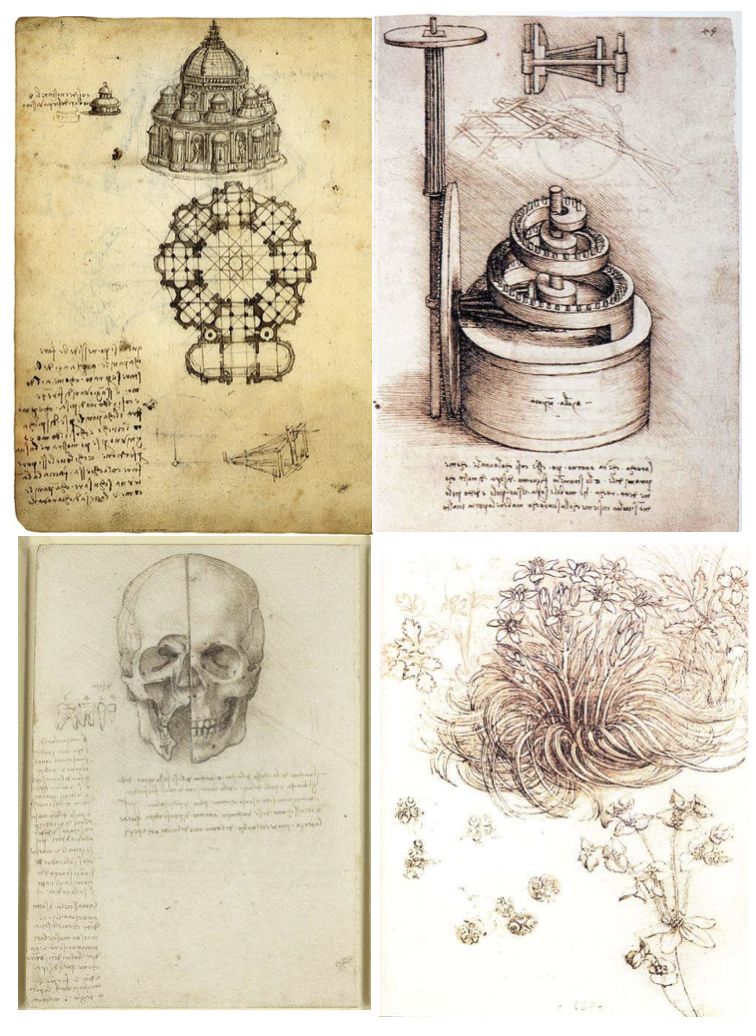 图 | 从左上到右下,分别是达·芬奇在建筑、机械、解剖、植物方面的研究(来源:网络)