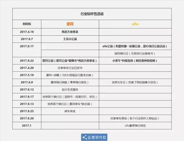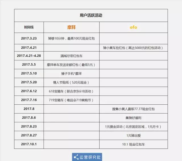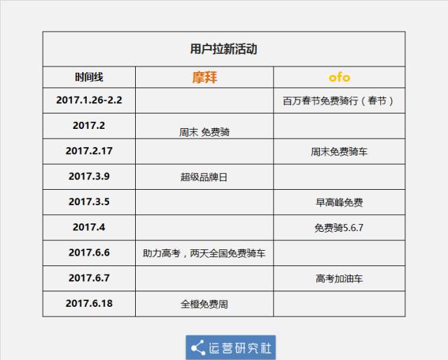 在用户拉新的活动运营上,可以说从今年 2 月份到 6 月份都是 ofo 领跑摩拜单车的,几乎都是小黄车先策划摩拜隔两天左右时间跟进。
