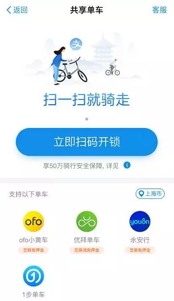 3 月 16 日,ofo 与芝麻信用达成战略合作推行“信用免押”模式,虽然在支付宝有了入口,不过藏的也忒深了(更多应用-便民生活),而且支付宝与 ofo 并非独家合作。