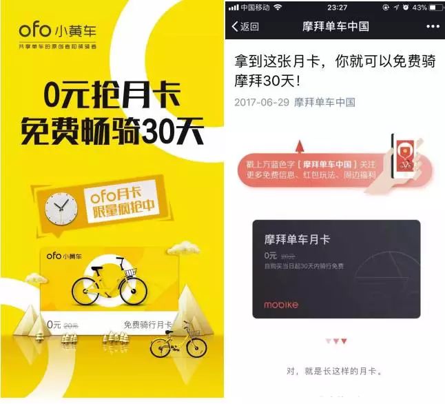 后知后觉的摩拜单车在 ofo 推出免费骑行近半个月后,才在 2 月底推出了“招行X摩拜免费骑行活动”。