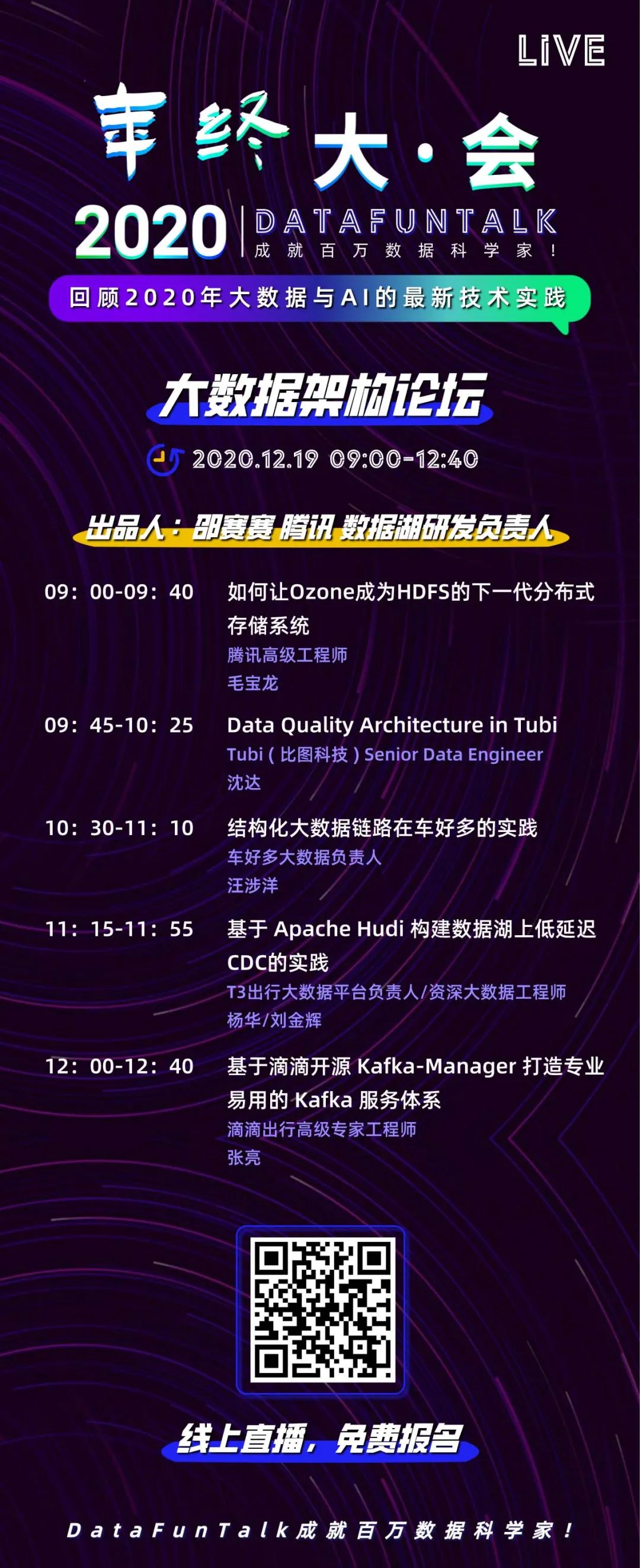 12月19日,09:00-12:40,在DataFunTalk年终大会大数据架构论坛上,来自Tubi的资深数据工程师沈达老师将分享《Data Quality Architecture in Tubi》,感兴趣的小伙伴欢迎识别海报中的二维码报名: